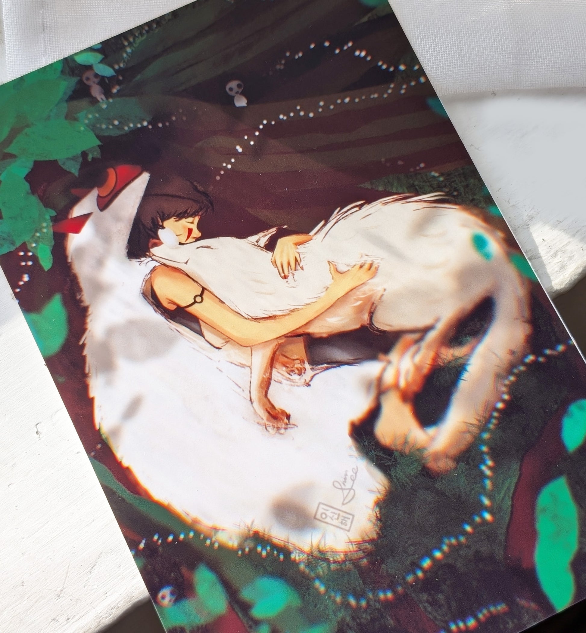 Inspired by one of my favorite Studio Ghibli movies, Princess Mononoke, this illustration features a peaceful moment of Princess Mononoke snuggling with one of her wolves.