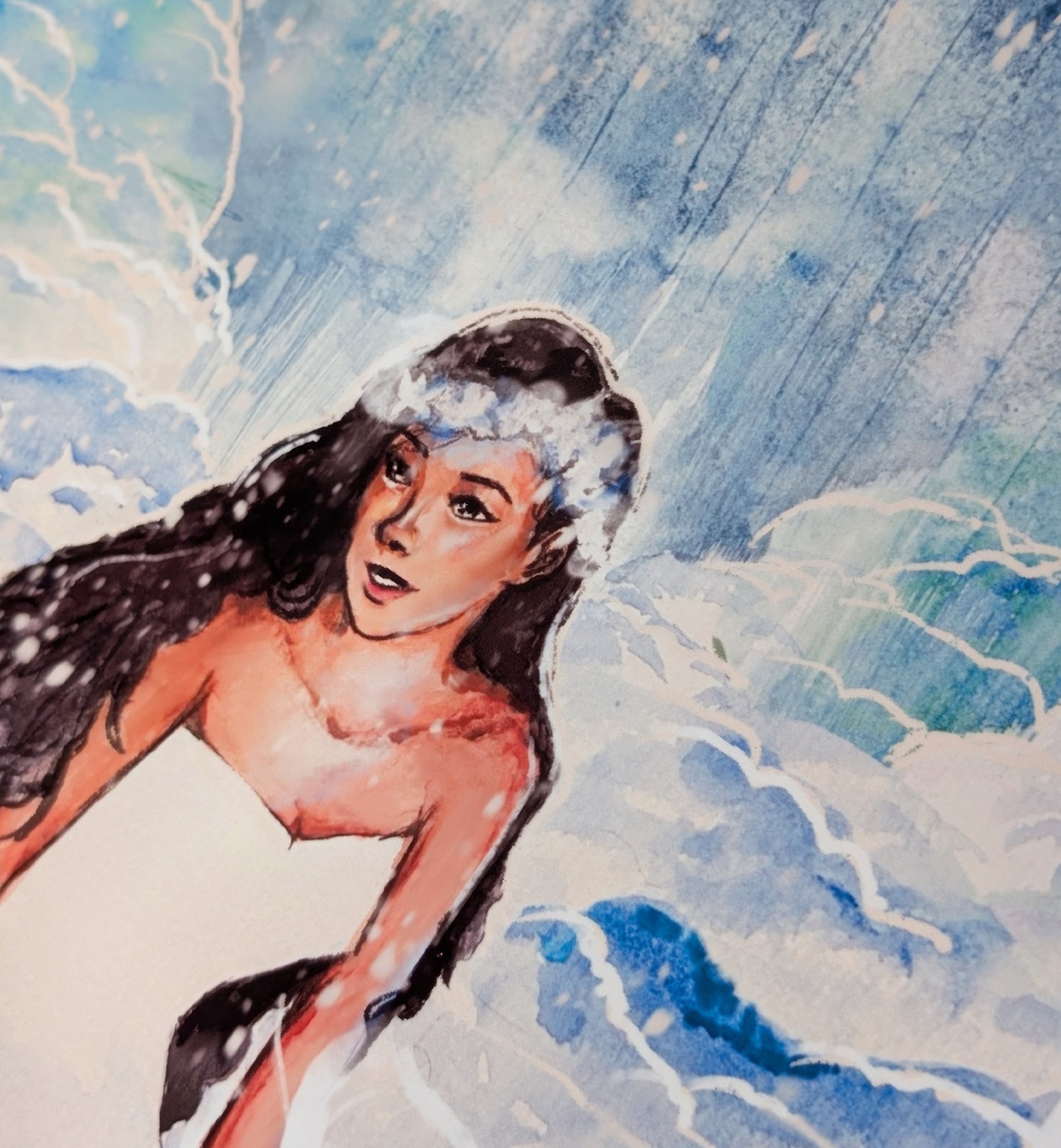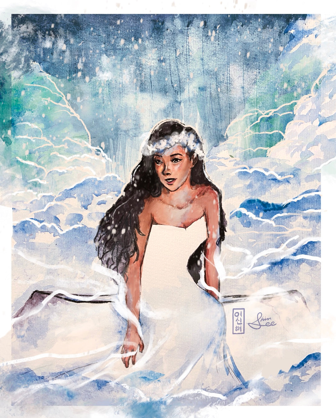 Inspired by my travels to Mauna Kea in the Island of Hawai'i, I created this watercolor painting after learning about the legends of one of the snow goddesses, Poli'ahu, who resides on the summit of Mauna Kea.